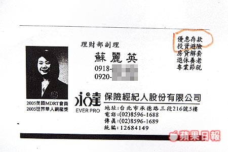 謝秀鳳指出,由於永達公司還銷售很多保險商品,後來蘇麗英陸續又向她推銷「其他優惠存款」,她簽了八份合約後,每年存下百餘萬元。